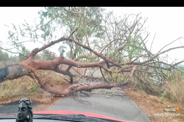 ఆ సమయంలో అక్కడ ఎవరు రాకపోకలు సాగించకపోవడంతో ప్రమాదం తప్పింది. సమాచారం తెలుసుకున్న గ్రామ సర్పంచ్ ఆంజనేయులు గౌడ్ గ్రామస్తులతో కలిసి ట్రాక్టర్ సహాయంతో చెట్టును రోడ్డు పై నుండి తొలగించారు. తక్షణమే స్పందించి ప్రయాణికుల ఇబ్బందులు తొలగించిన సర్పంచ్ పై పలువురు ప్రశంసలు కురిపించారు.