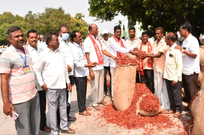 మిర్చికి కనీస మద్దతు ధర కింటాకు 25 వేల రూపాయలు ప్రకటించి ప్రభుత్వ కొనుగోలు కేంద్రాలు ఏర్పాటు చేయాలని డిమాండ్ చేశారు. ఈ కార్యక్రమంలో ఏఐకేఎఫ్ రాష్ట్ర సహాయ కార్యదర్శి ఎన్ రెడ్డి హంస రెడ్డి, జిల్లా ప్రధాన కార్యదర్శి కుసుంబా బాబురావు, జిల్లా అధ్యక్షుడు మహమ్మద్ ఇస్మాయిల్, ఏఐసిటియు జిల్లా అధ్యక్ష కార్యదర్శులు ముక్కెర రామస్వామి, సుంచు జగదీశ్వర్, రైతు సంఘం నాయకులు మంద రవి, కర్ర రాజిరెడ్డి, ఐతం నాగేష్, మొగిలి శ్రీనివాస రావు, పరిమళ గోవర్ధన్ రాజు, సోమిడి రవి, పేర బోయిన ఐలోని, నరసయ్య, ప్రభాకర్ లతోపాటు రైతులు పాల్గొన్నారు.