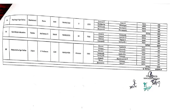 ప్యాడీ ప్రొక్యూర్ మెంట్ ముగిసే సమయంలో అంటే సుమారు పాతిక రోజుల కిందట సీఎంఆర్ బకాయి ఉండి మిల్లుల్లో ధాన్యం గింజ లేని గోదాంలోలేని మంజునాథ ఆగ్రో ఇండస్ట్రీస్ ఇందారంతో పాటు శార్వాణి ఇండస్ట్రీస్ లక్ష్మీపూర్, లక్ష్మీ ప్రసన్న రైస్ మిల్ జైపూర్, లక్ష్మీ శ్రీ రైస్ మిల్, సప్తగిరి ఆగ్రో ఇండస్ట్రీస్ మందమర్రి, శ్రీ క్రిష్ణ ఆగ్రో ఇండస్ట్రీస్ లకు కేటాయించడం పలు అనుమానాలకు తావిస్తోంది. మొదటి నుంచి కావాలని అడిగినా ఇవ్వని అధికారులు చివరలో ధాన్యం దించుకోవడానికి అవకాశం ఇవ్వడంలో మతలాబేమిటో, ఇది ఎవరి లబ్ధికోసమో అధికారులకే తెలియాలి.
