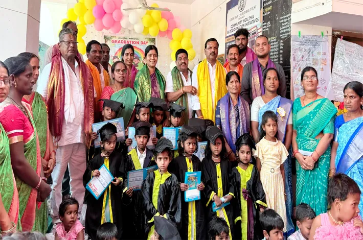 గుమ్మడిదల, ఏప్రిల్ 21 : కార్పొరేట్ పాఠశాలలకు ఏమాత్రం తీసిపోకుండా ప్రభుత్వ అంగన్వాడీలను అభివృద్ధి చేస్తున్నామని గుమ్మడిదల మున్సిపల్ చైర్మన్ చిమ్ముల సంధ్య గోవర్ధన్ రెడ్డి తెలిపారు. మున్సిపల్ పరిధిలోని బొంతపల్లి అంగన్వాడి కేంద్రంలో మంగళవారం అంగన్వాడి టీచర్ల ఆధ్వర్యంలో గ్రాడ్యుయేషన్ డే వేడుకలు ఘనంగా నిర్వహించారు.చిన్నారులు ప్రత్యేక వేషధారణలో ఆకట్టుకున్నారు.