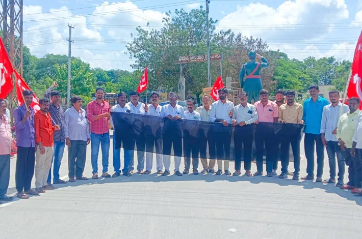 నకిరేకల్ (విజయక్రాంతి): రీజినల్ రింగ్ రోడ్డు పేరుతో రైతుల వద్ద బలవంతంగా భూములు లాక్కునే పద్ధతి సరైంది కాదని భూ నిర్వాసితుల పక్షాన పోరాడుతున్న సిపిఎం నాయకులను రైతులను అక్రమంగా అరెస్టు చేయడం ప్రజాస్వామికమని సిపిఎం జిల్లా కార్యదర్శి వర్గ సభ్యుడు జల్లెల పెంటయ్య ప్రభుత్వాన్ని విమర్శించారు. సిపిఎం నాయకులను రైతులను అరెస్టు నిరసిస్తూ రామన్నపేట మండల కేంద్రంలోని సుభాష్ సెంటర్ లో నల్ల జెండాలతో సిపిఎం కార్యకర్తలు నిరసన తెలిపారు. ఈ సందర్భంగా పెంటయ్య మాట్లాడుతూ త్రిపుర రోడ్డులో గతంలో చేసిన అలైన్మెంట్ కు విరుద్ధంగా నూతనంగా చేయడం అనేకమంది పేద రైతుల భూములు కోల్పోవాల్సిన పరిస్థితి ఏర్పడిందని దివిస్ లాంటి కార్పొరేటు బడా పెట్టుబడిదారులకు తలొగ్గి అమాయక రైతుల భూములు బలి చేయవద్దని అన్నారు. భూములు కోల్పోతున్న రైతులకు భూమికి బదులుగా భూమి ఇవ్వాలని డిమాండ్ చేశారు.