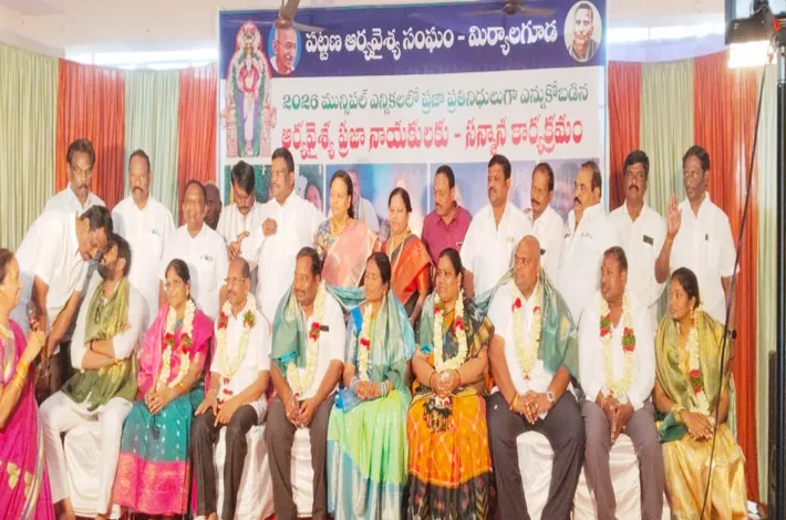 మిర్యాలగూడ, మార్చి1(విజయక్రాంతి) : ఆర్యవైశ్యులు ఆత్మ విమర్శ చేసుకోవాలని రాజకీయంగా ప్రాధాన్యత ఇవ్వని వారిని తిరస్కరించాలని పలువురు ఆర్యవైశ్య ప్రముఖులు పిలుపునిచ్చారు. ఆదివారం స్థానిక వాసవీ భవన్లో పట్టణ ఆర్యవైశ్య సంఘం అధ్యక్షులు మాజీ మున్సిపల్ చైర్మన్ తిరునగరు భార్గవ్ ఆధ్వర్యంలో ఏర్పాటు చేసిన ఇటీ వల మున్సిపల్ ఎన్నికల్లో విజయం సాధించిన ఆర్యవైశ్య అభ్యర్థులకు సన్మాన సభలో అఖిలభారత ఆర్యవైశ్య మహిళా నాయకురాలు రాయపూడి భవాని, ఆర్యవైశ్య సం ఘం జిల్లా మాజీ అధ్యక్షులు తెడ్ల జవహర్ బాబు, పందిరి రవీందర్, చిట్యాల మున్సిపల్ చైర్మన్ పందిరి గీతాలు మాట్లాడుతూ రాష్ట్రవ్యాప్తంగా ఆర్య వైశ్యులకు అన్ని రాజకీయ పార్టీల నుంచి సరైన ప్రాధాన్యత లభిం చడం లేదన్నారు.