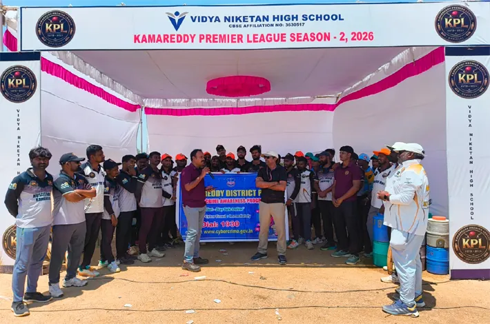 కామారెడ్డి జిల్లాలో నిర్వహిస్తున్న కామారెడ్డి ప్రీమియర్ లీగ్ (KPL) క్రీడా వేదికగా జిల్లా పోలీస్ శాఖ ఆధ్వర్యంలో ఈరోజు సైబర్ క్రైమ్ అవగాహన కార్యక్రమం నిర్వహించబడింది. ఈ కార్యక్రమం ద్వారా టోర్నమెంట్లో పాల్గొంటున్న క్రీడాకారులు మరియు యువతను ఆన్లైన్ మోసాల పట్ల చైతన్యపరచడమే ప్రధాన లక్ష్యంగా అధికారులు తెలిపారు. జిల్లా సైబర్ క్రైమ్ విభాగం (ౄ4C) ఎస్త్స్ర శ్రీ నరేష్ గారు కార్యక్రమాన్ని నిర్వహించి, సైబర్ నేరగాళ్లు అనుసరిస్తున్న వినూత్న మరియు ఆధునిక మోసపూరిత పద్ధతుల గురించి ఆటగాళ్లకు వివరించారు.