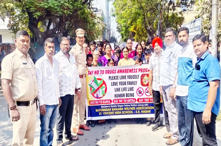 సనత్నగర్ ఫిబ్రవరి 12 (విజయక్రాంతి):- బాపునగర్లోని సెయింట్ విన్సెంట్ హైస్కూ ల్లో గురువారం ‘సే నో టు డ్రగ్స్’ అవగాహన కార్యక్రమం, ర్యాలీ ఘనంగా నిర్వహించారు. ఈ కార్యక్రమాన్ని హరిసింగ్ జాధవ్, పాఠశాల నిర్వహణ సమితి ఆధ్వర్యంలో నిర్వహించారు. కార్యక్రమానికి ముఖ్య అతిథిగా హాజరైన సంజీవరెడ్డినగర్ సబ్ఇన్స్పెక్టర్ సుధీర్ మా ట్లాడుతూ.. మాదకద్రవ్యాలు యువత జీవితాలను నాశనం చేస్తున్నాయని, డగ్స్ వంటి చెడు అలవాట్లకు దూరంగా ఉండాలని హెచ్చరించారు. పాఠశాల నిర్వహణ కమిటీ సభ్యులు, ఉపాధ్యాయులు, తల్లిదండ్రులు, స్థానిక ప్రజ లు పెద్ద సంఖ్యలో పాల్గొన్నారు.