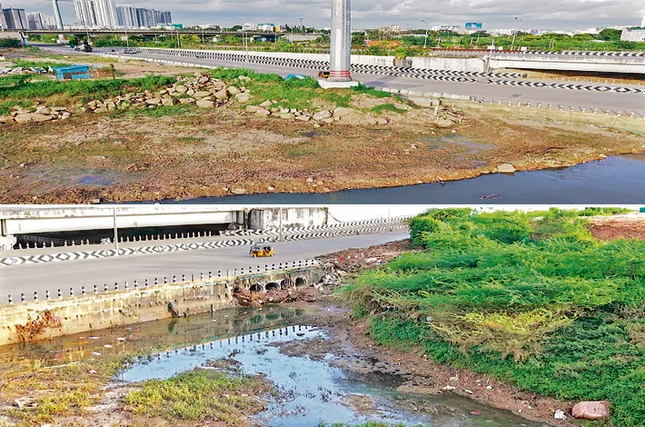 కృత్రిమంగా ఎత్తు పెంచేశారు. అంతేకాకుండా, నదీ ప్రవాహంలోనే భారీ బేస్మెంట్లతో హై టెన్షన్ విద్యుత్ లైన్ స్తంభాలను నిర్మించడంతో నది సహజ ప్రవాహ మార్గం కుంచించుకుపోయింది. ఈ కారణాల వల్లే, ఎగువ నుంచి వచ్చే వరద నీరు సాఫీగా ముందుకు వెళ్లలేక, పల్లంగా ఉన్న బఫర్ జోన్లోని ఆదిత్యా వాంటేజ్ ప్రాజెక్టు వైపు మళ్లుతోంది.