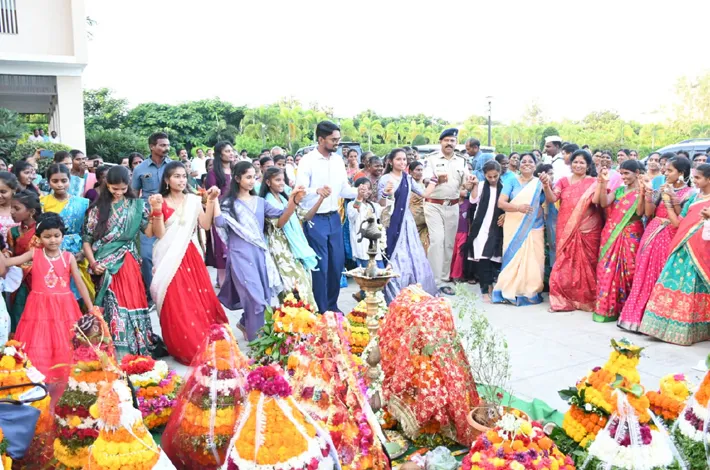వనపర్తి (విజయక్రాంతి): తెలంగాణ సంస్కృతికి అద్దం పట్టే పండుగ బతుకమ్మ అని జిల్లా కలెక్టర్ ఆదర్శ్ సురభి, జిల్లా ఎస్పీ గిరిధర్ రావుల అన్నారు. మంగళవారం జిల్లా కలెక్టరేట్ ఆవరణలో సెర్ప్, మెప్మా, జిల్లా సంక్షేమ శాఖల ఆధ్వర్యంలో సద్దుల బతుకమ్మ వేడుకలను ఘనంగా నిర్వహించారు. ఈ వేడుకలకు జిల్లా కలెక్టర్ ఆదర్శ్ సురభితో పాటు జిల్లా ఎస్పీ గిరిధర్ రావుల హాజరయ్యారు. తీరొక్క పువ్వులతో ముస్తాబు చేసిన బతుకమ్మ ప్రతిమలకు కలెక్టర్, ఎస్పీ పూజలు చేసారు. బతుకమ్మ చుట్టూ మహిళలు, చిన్నారులు బొడ్డెమ్మలు వేసి ఆడిన ఆటలు ఎంతో ఆకర్షించాయి. జిల్లా కలెక్టర్, ఎస్పీ సైతం మహిళలతో కలిసి బతుకమ్మ ఆడి అందరిని ఉత్సాహపరిచారు. అందరికీ బతుకమ్మ పండుగ శుభాకాంక్షలు తెలియజేశారు.
