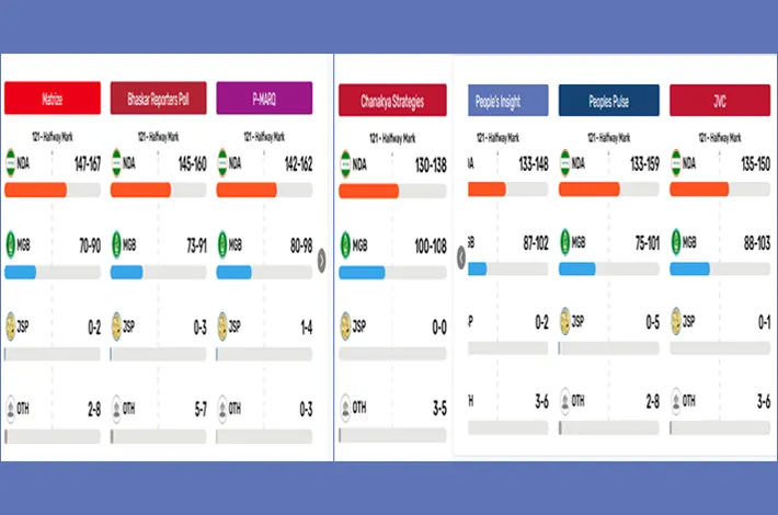 243 మంది సభ్యులున్న సభలో మాట్రిజ్, పీపుల్స్ పల్స్, భాస్కర్ సహా ఏడుగురు పోల్స్ చేసిన సర్వేలు ఎన్డీఏకు 133-159 సీట్లు వస్తాయని, అలాగే, ఆర్జేడీ, కాంగ్రెస్, వామపక్షాలతో కూడిన ప్రతిపక్ష మహాఘటబంధన్ 75–102 సీట్ల, ప్రశాంత్ కిశోర్ నేతృత్వంలోని జన్ సురాజ్ పార్టీకి 0-5 స్థానాలు, ఇతరులు 2-8 స్థానాల్లో విజయం సాధించవచ్చని అంచనా.