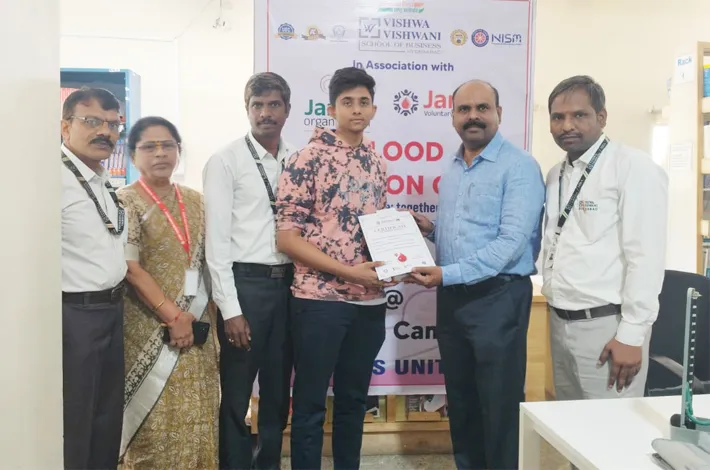 బ్లడ్ సెంటర్ ఫౌండర్ లక్ష్మిరెడ్డి మాట్లాడుతూ.. విశ్వ విశ్వాని విద్యార్థులు చదువుల్లో రానిస్తూ సమాజ సేవలో చురుకుగా పాల్గొనడం అభినందనీయమని తెలిపారు. రక్త దాతలకు వాటర్ బాటిల్, రూ.లక్ష ప్రమాద బీమాను అందజేశారు. కార్యక్రమంలో విశ్వ విశ్వాని కళాశాల ప్రెసిడెంట్ జీఎస్ఎస్ వెంకటేశ్వర్ రావు, కళాశాల ప్రధానోపాధ్యాయులు డా. ఎం మదనమోహన్, డా.ఎస్ శ్రీకాంత్, డైరెక్టర్లు డా. చక్రవర్తి, ప్రొ. మీర్ ఇర్ఫాన్ ఉల్ హా క్, వైస్ ప్రిన్సిపాల్ డా. డి రాఘవ, హెచ్వోడీ డా. ఏపీ గాయత్రి, ఎన్ఎస్ఎస్ పీవోలు పి శ్రీకాంత్ గౌడ్, శివ కుమార్ పాల్గొన్నారు.