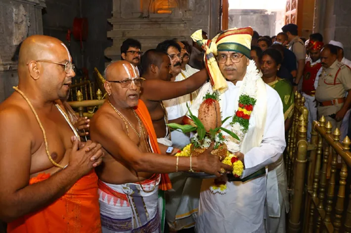 యాదగిరిగుట్ట,విజయక్రాంతి: యాదాద్రి శ్రీ లక్ష్మీనరసింహస్వామిని(Yadadri Sri Lakshmi Narasimha Swamy Temple) అపరేష్ కుమార్ సింగ్, చీఫ్ జస్టిస్ తెలంగాణ హై కోర్ట్ తెలంగాణ వారు శ్ద దర్శించుకున్నారు.వారితో పాటు హై కోర్ట్ న్యాయమూర్తులు జస్టిస్ శ్రీ కె లక్ష్మణ్ ' జస్టిస్ కె శరత్, జస్టిస్ కె సుజన మరియు జస్టిస్ వి రామకృష్ణా రెడ్డి శ్రీ స్వామి వారిని దర్శించుకున్నారు. కార్యనిర్వాహణాధికారి జి రవి IAS వారి ఆధ్వర్యములో శ్రీ స్వామి వారి దర్శన ఆశీర్వచన ఏర్పాట్లు గావింపబడినవి.దర్శనం అనంతరము శ్రీ స్వామి వారి ప్రసాదము, ఫోటో అందజేయుట జరిగినది