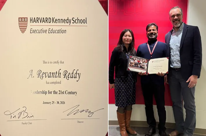 హైదరాబాద్: ముఖ్యమంత్రి రేవంత్ రెడ్డి(CM Revanth Reddy) ప్రతిష్టాత్మక హార్వర్డ్ కెన్నెడీ స్కూల్లో(Harvard Kennedy School) 21వ శతాబ్దంలో నాయకత్వం అనే కార్యనిర్వాహక విద్యా కార్యక్రమాన్ని పూర్తి చేశారు. 20 దేశాల నుండి సీఎంతో పాటు 62 మంది ఇతర భాగస్వాములు కోర్సును విజయవంతంగా పూర్తి చేయడంతో ముగిసింది. ఈ కార్యక్రమంలో ఉదయం 7:00 గంటల నుండి సాయంత్రం 6:00 గంటల వరకు రోజువారీ సెషన్లతో కూడిన విస్తృతమైన విద్యా కార్యకలాపాలు జరిగాయి. ఇందులో నిర్మాణాత్మక చర్చలు, సమూహ కార్యకలాపాల ద్వారా నాయకత్వం, అధికారం, పరిపాలనపై దృష్టి సారించారు.
