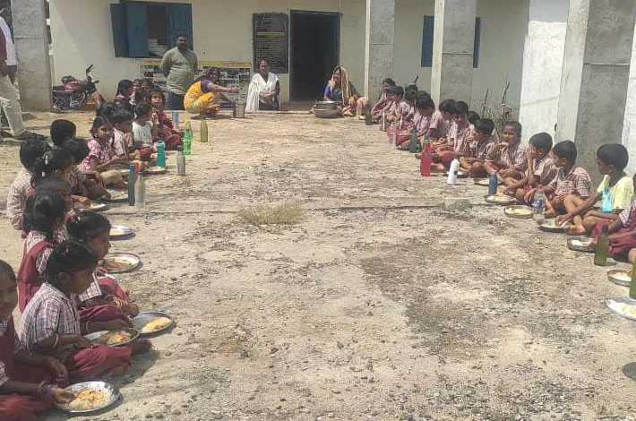 తీవ్ర ఎండలోనే విద్యార్థుల మధ్యాహ్న భోజనం..