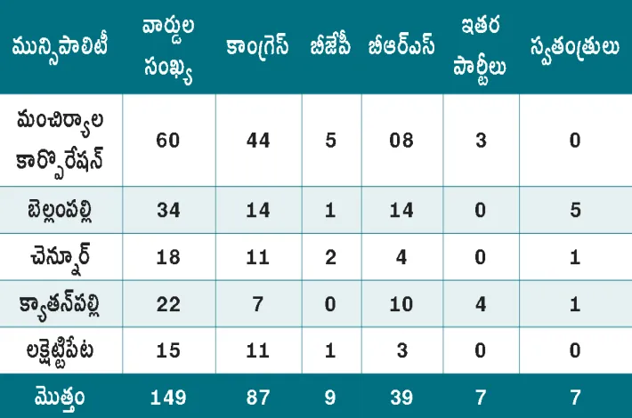 జిల్లాలోని మంచిర్యాల కార్పొరేషన్ తో పాటు బెల్లంపల్లి, చెన్నూర్, క్యాతనపల్లి, లక్షెట్టిపేట మున్సిపాలిటీల పరిధిలోని 149 (60 డివిజన్ లు, 89 కౌన్సిలర్ స్థానాలకు) వార్డులకు ఈ నెల 11న ఎన్నికలు జరుగగా శుక్ర వారం వెలువడిన ఫలితాల గాలి కాంగ్రెస్ వైపే వీచినట్లయింది. మంచిర్యాల కార్పొరేషన్లో 60 డివిజన్లకు 44 కాంగ్రెస్ దక్కిం చుకోగా బీఆర్ఎస్ ఎనిమిది, బీజేపీ ఐదు, ఏఐఎఫ్బీ రెండు, జనసేన ఒక స్థానంలో గెలిచింది. బెల్లంపల్లి మున్సిపాలిటీ పరిధిలోని 34 వార్డులకు కాంగ్రెస్ 14, బీఆర్ఎస్ 14, బీజేపీ ఒకటి, ఇండిపెండెంట్లు ఐదు స్థానా లు గెలిచాయి. అలాగే చెన్నూర్ మున్సిపాలిటీలోని 18 వార్డులకు కాంగ్రెస్ 11, బీఆర్ఎస్ నాలుగు, బీజేపీ రెండు, స్వతంత్రులు ఒకరు విజయం సాధించారు. క్యాతనపల్లి మున్సిపాలిటీలోని 22 వార్డులలో కాంగ్రెస్ ఏడు, బీఆర్ఎస్ పది, సీపీఐ నాలుగు, ఇండిపెండెంట్ ఒకరు గెలుపొందారు.
