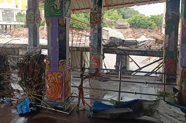 ప్రవాహంలో కొట్టుకుపోయిన ప్రసాదం కౌంటర్, ఆలయం ముందు రేకులు