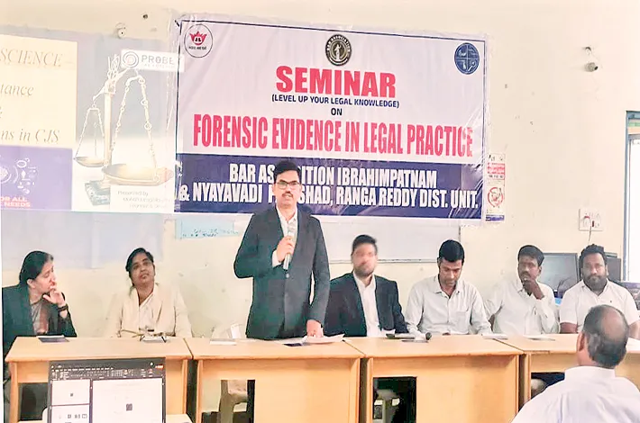 హైదరాబాద్, డిసెంబర్ 17 (విజయక్రాంతి): బార్ అసోసియేషన్ ఇబ్రహీంప ట్నం, న్యాయవాది పరిషత్ రంగారెడ్డి జిల్లా ఆధ్వర్యంలో న్యాయవాదులకు, జడ్జిలకు, కోర్టు సిబ్బందికి ఫోరెన్సిక్ ఎవిడెన్స్ ఇన్ లీగ ల్ ప్రాక్టీస్పై అవగాహన సదస్సు నిర్వహించారు. 15వ అదనపు జిల్లా జడ్జి ప్రవీణ్కు మార్ హాజరై ఫోరెన్సిక్ ఎవిడెన్స్ ఇన్ లీగల్ ప్రాక్టీస్ ప్రతి న్యాయవాదికి న్యాయమూర్తులకు, సిబ్బందికి, పోలీసువారు తప్పనిసరిగా తెలుసుకోవాలన్నారు.