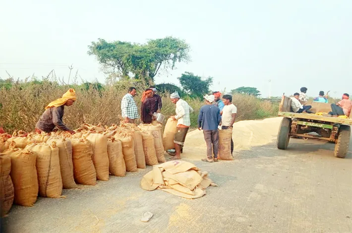 -స్థలం లేక రోడ్లపై ధాన్యం ఆరబెడుతున్న అన్నదాతలు