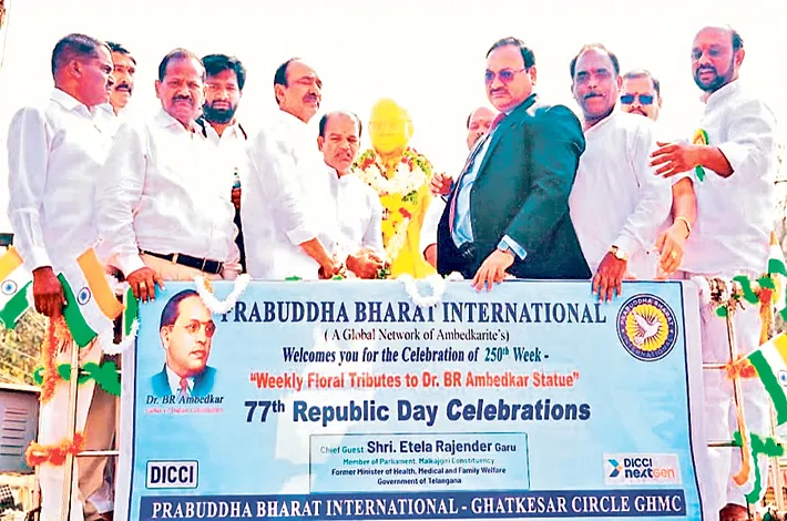 ఘట్ కేసర్, జనవరి 25 (విజయక్రాంతి): భారతదేశాన్ని ఒక గొప్ప రాజ్యంగా రూపకల్పన చేసిన మహానేత డాక్టర్ బి.ఆర్. అంబేద్కర్ అని మల్కాజిగిరి పార్లమెంట్ సభ్యులు ఈటెల రాజేందర్ అన్నారు. ప్రబుద్ధ భారత్ ఇంటర్నేషనల్ ఆధ్వర్యంలో బాబాసాహెబ్ అంబేద్కర్ ఆలోచనా విధానాన్ని ప్రజల వద్దకు తీసుకెళ్లడానికి ఆదివారం ఘట్ కేసర్ పట్టణంలో 250వవారం నిత్య పూలమాల కార్యక్రమం నిర్వహించారు.