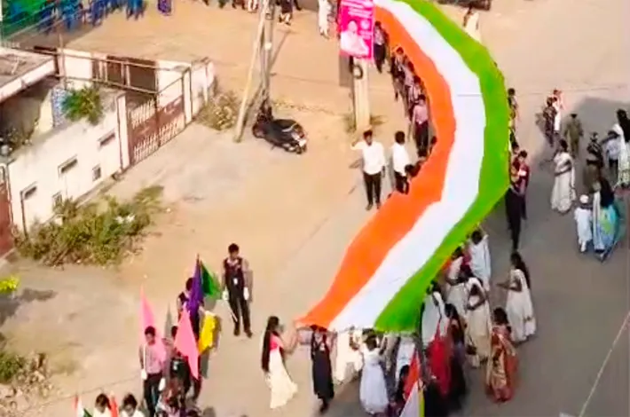 పాల్వంచ, జనవరి 26, (విజయక్రాంతి): పాల్వంచలోని ఆదర్శ ఇంటిగ్రేట్ మోడల్ స్కూల్ విద్యార్థులు 77వ గణతంత్ర దినోత్సవాన్ని పురస్కరించుకొని 100 మీటర్ల భారీ జాతీయ పతకంతో వివిధ రకాల దేశ నాయకుల చిత్రపటాలతో నిర్వహించిన ర్యాలీ ఎంతో ఆకర్షణగా నిలిచింది. అనంతరం గణతంత్ర దినోత్సవ గొప్పతనం గురించి పాఠశాల ప్రిన్సిపాల్ రెంటాల నాగభూషణం విద్యార్థులకు వివరించారు. విద్యార్థిని విద్యార్థులు ఉపాధ్యాయుని ఉపాధ్యాయులు తల్లిదండ్రులు పాల్గొని విజయవంతం చేశారు.