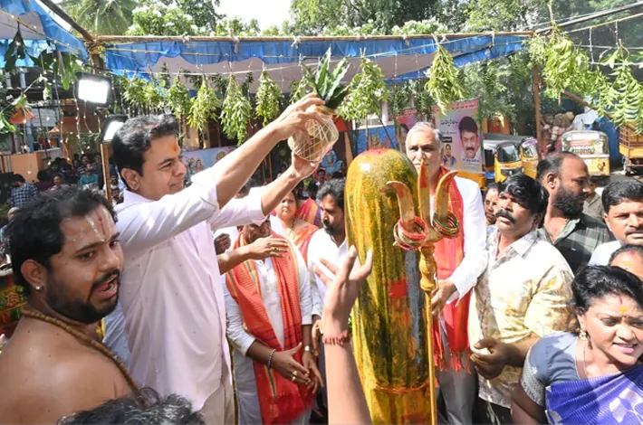 హైదరాబాద్: సికింద్రాబాద్ బన్సీలాల్ డివిజన్ లోని హమాలీ బస్తిలో శ్రీ శ్రీ శ్రీ బొడ్రాయి మహోత్సవం పండుగను ఘనంగా నిర్వహించారు. ఈ కార్యక్రమానికి బీఆర్ఎస్ వర్కింగ్ ప్రెసిడెంట్ కేటీఆర్, మాజీ మంత్రులు హరీశ్ రావు, తలసాని శ్రీనివాస్ యాదవ్, మాజీ డిప్యూటీ స్పీకర్, ఎమ్మెల్యే పద్మరావు హాజరయ్యారు. బొడ్రాయికి కలశంతో నీళ్లు పోసి, పూజలు నిర్వహించారు. సికింద్రాబాద్ బీఆర్ఎస్ కార్యకర్తలు డప్పు వాయిద్యాలు, బోనాలతో ఘన స్వాగతం పలికారు. ఈ సందర్భంగా కేటీఆర్ మాట్లాడుతూ... ఎవరికి అపద వచ్చిన అండగా ఉండే నాయకుడు తలసాని శ్రీనివాస్ యాదవ్ అని, రెండు ఏండ్ల నుంచి మీరు ఎన్ని ఇబ్బందులు పడుతున్నారో మాకు తెలుసన్నారు.