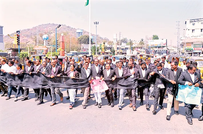 నల్లగొండ టౌన్, ఫిబ్రవరి 19 : న్యాయవాది కుటుంబం పై దాడి చేయడాన్ని తీవ్రంగా ఖండిస్తూ బార్ అసోసియేషన్ ఆధ్వర్యంలో గురువారం కోర్టు విధులు బహిష్కరించి నిరసన ర్యాలీ చేపట్టారు. ఈ సందర్భంగా జిల్లా బార్ అసోసియేషన్ అధ్యక్ష కార్యదర్శులు కట్ట అనంతరెడ్డి మంద నగేష్ లు మాట్లాడుతూ దాడి చేసిన నిందితులను వెంటనే అరెస్టు చేయాలని డిమాండ్ చేశారు. న్యాయవాది జి.నరేష్ నివాసంపై బుధవారం రాత్రి కొంతమంది దుండగులు దాడి చేసి ఆయన కుటుంబ సభ్యులను భయభ్రాంతులకు గురిచేయడమే కాకుండా హత్యాయత్నానికి కూడా వెనుకాడకపోవడం అమానుషమైన చర్య అన్నారు.