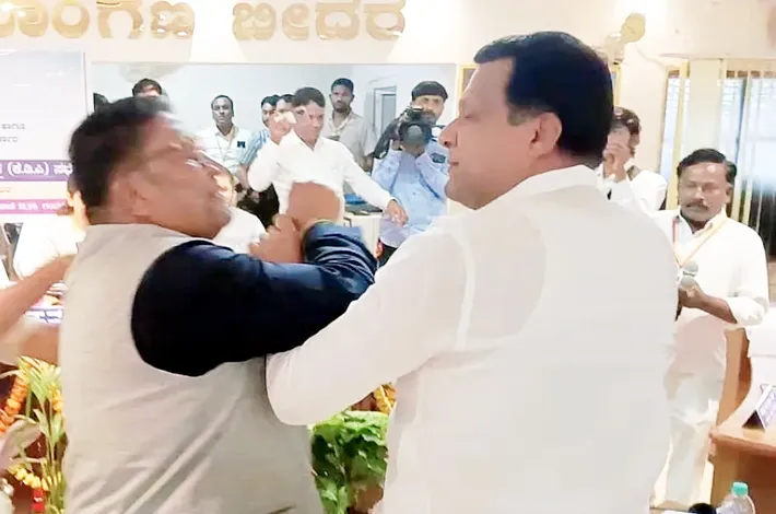 ఈ క్రమంలో ఎమ్మెల్యే, ఎమ్మెల్సీ మధ్య తీవ్ర వాగ్వాదం చోటుచేసుకుంది. అది కాస్త ఘర్షణకు దారి తీసి ఒకరిపై ఒకరు దాడి చేసుకున్నారు. మంత్రి ఈశ్వర్ ఖండ్రే ఇరుపక్షాలను శాంతింపజేయడానికి చేసిన ప్రయత్నాలు ఏవీ ఫలించలేదు. అక్కడే ఉన్న ఇతర ప్రజాప్రతినిధులు, నాయకులు, పోలీసులు కొన్నినిమిషాల పాటు నచ్చజెప్పి వారిద్దరిని శాంతింపజేశారు. అనంతరం యంత్రాంగం అనివార్యంగా సమావేశాన్ని వాయిదా వేయాల్సి వచ్చింది. ప్రజలకు మేలు చేసే నిర్ణయాలు తీసుకునే సమావేశంలో బాధ్యతగల ఇద్దరు ప్రజాప్రతినిధులు తన్నుకోవడంపై ఆ రాష్ట్ర ప్రజానీకం మండిపడుతోంది.