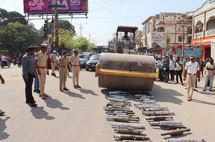 కామారెడ్డి నిజాంసాగర్ చౌరస్తాలో మాడిఫైడ్ సైలెన్సర్ల ధ్వంసం