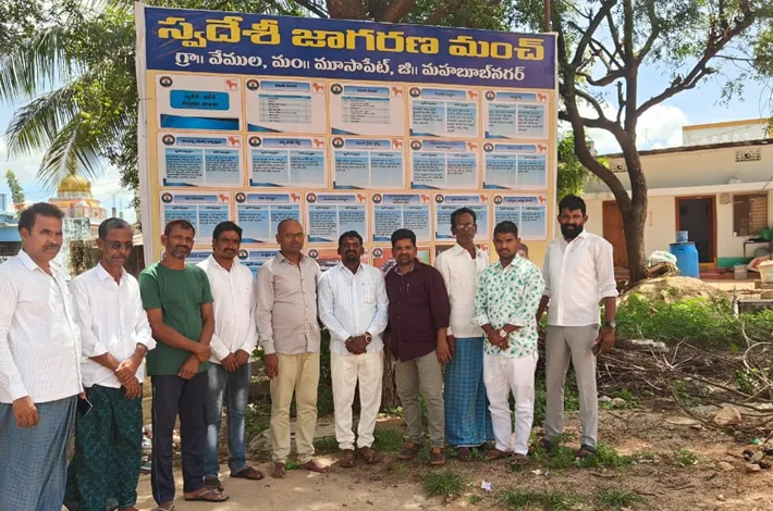 ప్రపంచవ్యా ప్తంగా ఆర్థిక, రాజకీయ అనిశ్చితులు పెరుగుతున్న ఈ కాలంలో... వ్యాపార మార్గాలు, చెల్లింపు విధానాలు, కరెన్సీలు ఆయుధాలుగా మారుతు న్నాయన్నారు. అమెరికా, పాశ్చాత్య దేశాలు రక్షణాత్మక విధానాలు అవలంబిస్తూ అధిక పన్ను లు, అన్యాయ పూర్వక అడ్డంకులతో ప్రపంచ ఎగుమతులను అడ్డుకుంటున్నాయన్నారు. చైనా వంటి దేశాలు అధిక ఉత్పత్తి సామర్థ్యాన్ని ఉపయోగించి అతి తక్కువ ధరలో, నాసిరకం వస్తువు లను డంప్ చేస్తూ, బలహీనపరుస్తున్నాయని, స్వదేశీ ఆచరణనే మన జాతీయ ప్రయోజనాలను కాపాడే ప్రధాన ఆయుధమన్నారు. ఈ కార్యక్రమంలో వేముల గ్రామస్తులు స్వదేశీ జాగరణ మంచు మహబూబ్నగర్ జిల్లా కన్వీనర్ తిరుపతి గారి ప్రభాకర్ రెడ్డి స్వదేశీ జాగరణ మంచు దేవరకద్ర నియోజకవర్గ కన్వీనర్ వృద్ధుల గణేష్ నాయుడు మూసాపేట భారతీయ జనతా పార్టీ అధ్యక్షులు తాటికొండ నరసింహులు, ఆంజనేయులు, సంజీవరెడ్డి,చెన్నారెడ్డి,రాములు పాల్గొన్నారు.