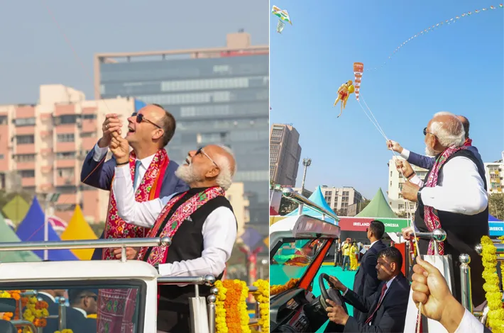 అహ్మదాబాద్: ప్రధానమంత్రి నరేంద్ర మోడీ(PM Narendra Modi) సోమవారం అహ్మదాబాద్లోని సబర్మతి నదీతీరంలో అంతర్జాతీయ కైట్ ఫెస్టివల్-2026ను ప్రారంభించారు. తరువాత జర్మన్ ఛాన్సలర్ ఫ్రెడరిక్ మెర్జ్తో(German Chancellor Friedrich Merz) కలిసి గాలిపటాలు ఎగురవేయడాన్ని ఆస్వాదించారు. సబర్మతి ఆశ్రమంలో మహాత్మా గాంధీకి నివాళులర్పించిన తర్వాత, ప్రధాని మోదీ, ఛాన్సలర్ మెర్జ్ సబర్మతి రివర్ఫ్రంట్కు వెళ్లారు. అక్కడ రాష్ట్ర ప్రభుత్వం పతంగుల పండుగను నిర్వహించింది. కార్యక్రమ వేదిక వద్ద, ప్రధాని మోదీ, మెర్జ్ మహిళా కళాకారులతో ముచ్చటించి, గాలిపటాలు తయారుచేసే ప్రక్రియను తెలుసుకున్నారు. ప్రారంభోత్సవం అనంతరం, ఇద్దరు నాయకులు ఒక తెరిచిన వాహనంలో మైదానంలో పర్యటించారు. కైట్ ఫెస్టివల్ ప్రాంగణంలో సాంస్కృతిక ప్రదర్శనలను ప్రధాని తిలకించారు. సందర్శకులకు ప్రధాని మోదీ, జర్మనీ ఛాన్స్ లర్ ఫ్రెడ్రిక్ మెర్జ్ అభివాదం తెలిపారు.