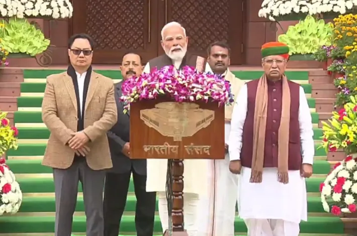 న్యూఢిల్లీ: రాష్ట్రపతి ద్రౌపది ముర్ము ప్రసంగం 140 కోట్ల మంది భారతీయుల ఆత్మ విశ్వాసాన్ని ప్రతిబింబించిందని ప్రధాని మోదీ(PM Narendra Modi) పార్లమెంట్ వద్ద మాట్లాడుతూ అన్నారు. ఈయూతో భారత్ స్వేచ్ఛా వాణిజ్య ఒప్పందం శుభసూచికమని పేర్కొన్నారు. ప్రపంచానికి భారత్ ఆశాకిరణం అన్నారు. వికసిత్ భారత్ కోసం ఎంపీలు కృషి చేయాలని పిలుపునిచ్చారు. అన్ని రంగాల్లో అభివృద్ధి దిశగా భారత్ దూసుకెళ్తోందని ప్రధాని తెలిపారు. ఎంతో కాలం నుంచి పెండింగ్ లో ఉన్న సమస్యలకు పరిష్కారం లభిస్తోందన్నారు. ఏ నిర్ణయం తీసుకున్నా.. సామాన్య ప్రజలకు మేలు చేసేలా ఉంటాయని పేర్కొన్నారు.