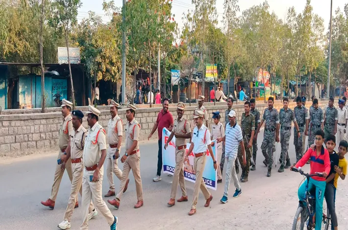 నిజామాబాద్, ఫిబ్రవరి 8 (విజయ క్రాంతి): నిజామాబాద్ జిల్లాలో జరగబోయే మున్సిపల్ కార్పొరేషన్ ఎన్నికలను ప్రశాంతంగా, నిష్పక్షపాతంగా నిర్వహించేందుకు పోలీసులు పకడ్బందీ ప్రణాళిక రూపొందించారు. ఇందులో భాగంగా నిజామాబాద్ జిల్లాలో ఎన్నికలు జరగనున్న నిజామాబాద్ కార్పొరేషన్ తో పాటు బోధన్ ఆర్మూర్ భీంగల్ మున్సిపాలిటీల పరిధిలో పోలీస్ శాఖ ఆధ్వర్యంలో పోలీస్ ఫ్లాగ్ మార్చ్ కార్యక్రమాలు నిర్వహించాల్సిందిగా సిపి సాయి చైతన్య ఆదేశాలు జారీ చేశారు. ఇందులో భాగంగానే సున్నిత ప్రాంతాలైన బోధన్ పురవీధుల్లో ముందుగా పోలీస్ ఫ్లాగ్ మార్చ్ నిర్వహించారు.