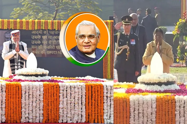 న్యూఢిల్లీ: మాజీ ప్రధాని అటల్ బిహారీ వాజ్పేయి 101వ జయంతి(Atal Bihari Vajpayee) సందర్భంగా గురువారం నాడు ఆయన స్మారక చిహ్నమైన 'సదైవ్ అటల్' వద్ద జరిగిన ప్రార్థనా కార్యక్రమంలో రాష్ట్రపతి ద్రౌపది ముర్ము, ఉపరాష్ట్రపతి సి.పి. రాధాకృష్ణన్, ప్రధానమంత్రి నరేంద్ర మోదీతో(PM Narendra Modi) పాటు పలువురు ప్రముఖులు పాల్గొని ఆయనకు నివాళులర్పించారు.