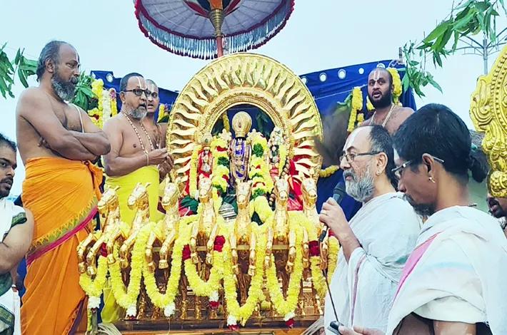 ముందుగా ఈరోజు తెల్లవారుజామున నా లుగు గంటలకు ప్రధాన ఆలయంలో మూ లమూర్తులకు సుప్రభాత సేవ, ఆరాధన, బాలభోగాధి కార్యక్రమాల అనంతరం సూర్యోదయ సమయానికి స్వామివారు సీతాలక్ష్మణ సమితుడై గోశాల వద్దకు చేరుకొని సూర్యప్రభ వాహనంపై సూర్యుడికి అభిముఖంగా ఉన్న స్వామివారి సన్నిధిలో సామూహిక ఉదయాదిత్య పారాయణం అనంతరం స్వామివార్లకు హారతి నివేదన చేసిన అర్చకులు, సీతారామచంద్ర స్వామివారికి సూర్యప్రభ వాహనంపై తిరువీధి సేవ ఘనంగా నిర్వహించారు.
