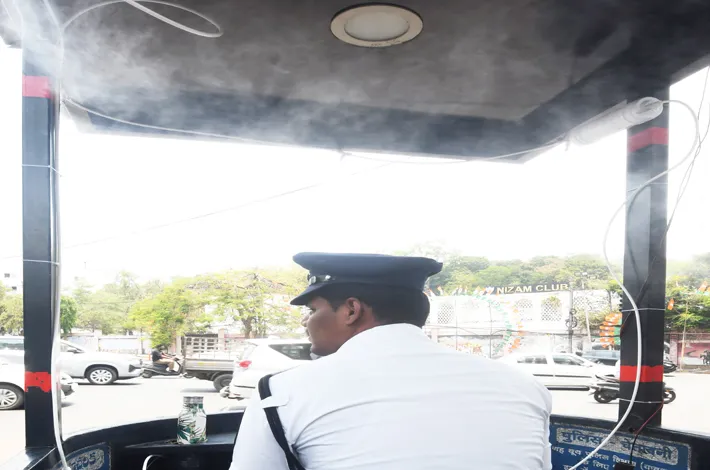 విధి నిర్వహణలో భాగంగా ట్రాఫిక్‌ను క్రమబద్ధీకరించే పోలీసులు ఎండ, వాన, చలి.. ఇలా ఏ కాలమైన వారు రహదారుపై ఉండాల్సిందే. ఈక్రమంలో హైదరాబాద్ రవీంద్రభారతి వద్ద ట్రాఫిక్ బూతులో నీటి తుంపర్లు పడేలా ఏర్పాటుచేసిన ‘మిస్ట్ ఎయిర్ కూలింగ్ సిస్టం’తో ఎండ నుంచి ఉపశమనం పొందుతున్న ట్రాఫిక్ పోలీస్