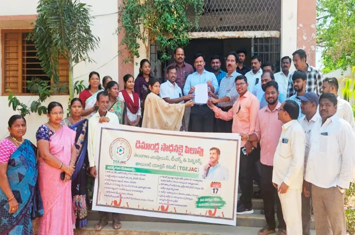 కల్వకుర్తి ఏప్రిల్ 17: ఉద్యోగుల సమస్యలను పరిష్కరించాలంటూ ఎంప్లాయిస్ టీచర్స్, పెన్షనర్స్ జాయింట్ యాక్షన్ కమిటీ ఆ ధ్వర్యంలో శుక్రవారం కల్వకుర్తి ఆర్డిఓ జనార్దన్ రెడ్డికి వినతిపత్రం అందజేశారు. ఎమ్మార్వో కార్యాలయం నుండి ఆర్డిఓ కార్యాలయం వరకు ర్యాలీగా చేరుకున్న ఉద్యోగులు, రాష్ట్ర జేఏసీ పిలుపు మేరకు తమ డిమాండ్లను అధికారుల దృష్టికి తీసుకెళ్లారు.