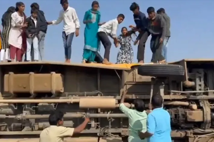 హైదరాబాద్: రంగారెడ్డి జిల్లా శంషాబాద్(Shamshabad) రోడ్డుపై వేగంగా వస్తున్న కారు ఢీకొనడంతో ఒక ప్రైవేట్ పాఠశాలకు చెందిన విద్యార్థులు ప్రయాణిస్తున్న బస్సు బోల్తా(School bus overturns ) పడింది. ఈ ఘటనలో పలువురు విద్యార్థులకు గాయాలయ్యాయి. హైదరాబాద్లోని జలవిహార్కు పిక్నిక్ యాత్రకు వెళ్తున్న ఒక ప్రైవేట్ పాఠశాలకు చెందిన సుమారు 60 మంది విద్యార్థులు ఆ బస్సులో ఉన్నారు. శంషాబాద్ రోడ్డుపై, ఒక కారు వేగంగా వచ్చి బస్సును వెనుక నుండి ఢీకొట్టింది. దానివల్ల బస్సు డ్రైవర్ వాహనంపై నియంత్రణ కోల్పోయాడు. బస్సు రోడ్డు పక్కన ఉన్న బారికేడ్ను ఢీకొని బోల్తా పడింది. స్థానికులు, పోలీసులు బస్సులో చిక్కుకున్న విద్యార్థులను బయటకు తీసి, చికిత్స కోసం ఆసుపత్రికి తరలించారు. విద్యార్థులకు స్వల్ప గాయాలయ్యాయి. పోలీసులు దర్యాప్తు చేస్తున్నారు.