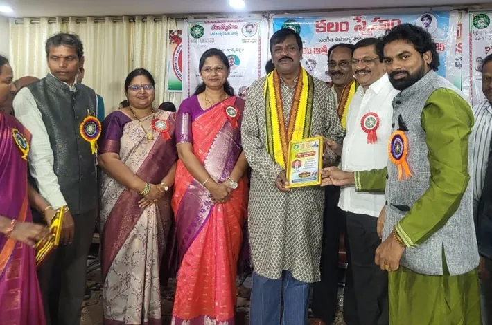 నిర్మల్ (విజయక్రాంతి): నిర్మల్ కు చెందిన కవియాత్ర జాతీయ ప్రధాన కార్యదర్శి, తెలంగాణ రచయితల వేదిక జిల్లా ప్రధాన కార్యదర్శి, ప్రముకపద్యకవి, వ్యాఖ్యాత డా బి.వెంకట్ కలం స్నేహం రాష్ట్రస్థాయి ఆత్మీయ సమ్మేళన సన్మానాన్ని కలం స్నేహం వ్యవస్థాపకులు ఆచార్య గోపాల్,డా కావేరి ఫౌండేషన్ చైర్మన్ డా అప్పాల చక్రధారి, జాతీయ కన్వీనర్ గీతాశ్రీ స్వర్గం, జిల్లా అధ్యక్షులు దేవిప్రియ, సమన్వయ కార్యదర్శులు కడారి దశరథ్, కొండూరి పోతన్న, తెలంగాణ రచయితల వేదిక జిల్లా అధ్యక్షులు నేరెళ్ళ హన్మంతుల చేతులమీదుగా అందుకున్నారు.