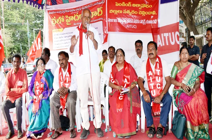 మధ్యాహ్న భోజన కార్మికుల సమస్యలు పరిష్కరించాలని ఎఐటియుసి అనుబంధ సం ఘం తెలంగాణ మధ్యాహ్న భోజన పథకం వర్కర్స్ యూనియన్ ఆధ్వర్యంలో సోమవా రం చలో హైదరాబాద్ కార్యక్రమంలో భాగం గా ఇందిరాపార్కు వద్ద భారీ ధర్నా కార్యక్రమం యూనియన్ రాష్ట్ర అధ్యక్షురాలు పి. ప్రేంపావని అధ్యక్షత జరిగింది. ఈ ధర్నాకు ఎమ్మెల్యే కూనంనేని ముఖ్యఅతిథిగా హాజరై మాట్లాడుతూ వంట కార్మికులు అసెంబ్లీ వెలుపల పోరాటాల ద్వారా హక్కుల సాధనకు ఉద్యమించాలని పిలుపునిచ్చారు.