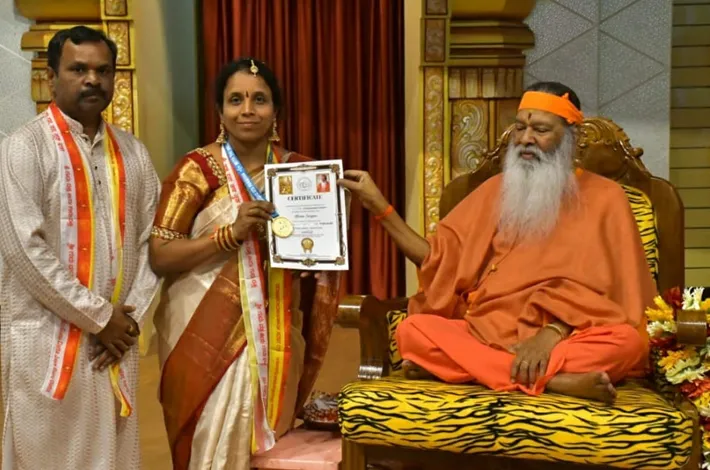 సుల్తానాబాద్ (విజయక్రాంతి): పెద్దపల్లి జిల్లా సుల్తానాబాద్ పట్టణానికి చెందిన వ్యాపారవేత్త అల్లెంకి సురేష్ సప్న ఆదర్శ దంపతులు భగవద్గీత ఆన్లైన్ క్లాసులో భాగంగా మైసూర్ లో శ్రీ గణపతి సచ్చిదానంద స్వామీజీ హస్తములచే బంగారు పతకం, సర్టిఫికెట్ తీసుకున్నారు. ఈ సందర్భంగా సోమవారం సురేష్ స్వప్న దంపతులకు సుల్తానాబాద్ ఆర్యవైశ్య సంఘం తరఫున ప్రత్యేక అభినందనలు తెలియజేయడం జరిగింది.