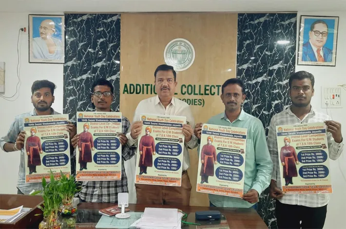 ఆదిలాబాద్,(విజయక్రాంతి): స్వామి వివేకానందున్ని యువత ఆదర్శంగా తీసుకోవాలని జిల్లా అడిషనల్ కలెక్టర్ రాజేశ్వర్ రావు అన్నారు. వివేకానంద 164వ జయంతిని పురస్కరించుకుని జాతీయ యువజనుల దినోత్సవం సందర్భంగా శ్రీ రామకృష్ణ సేవా సమితి ఆధ్వర్యంలో విద్యార్థులకు నిర్వహించే వివేకానందునీ జీవితం-సందేశం పై పోటీ పరీక్షల పోస్టర్లను బుధవారం ఆయన చేతుల మీదుగా విడుదల చేసారు.