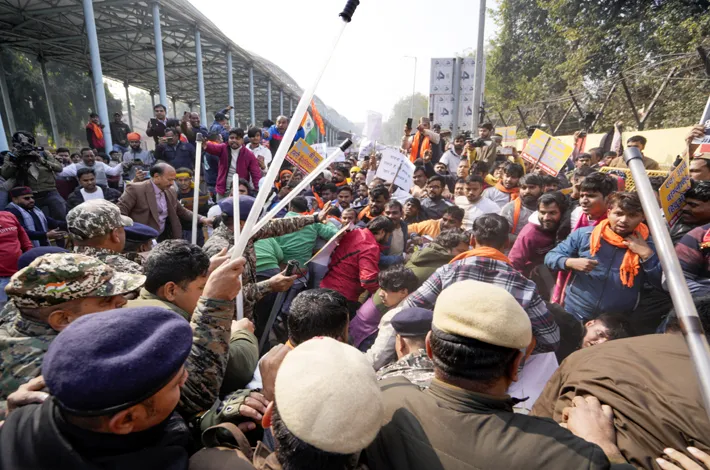 న్యూఢిల్లీ, డిసెంబర్ ౨౩: దేశ రాజధాని న్యూఢిల్లీలోని బంగ్లాదేశ్ హైకమిషన్ కార్యాలయం వద్ద మంగళవారం ఉద్రిక్తత చోటుచేసుకుంది. బంగ్లాదేశ్లో వరుసగా హిందువులపై జరుగుతున్న దాడులతోపాటు దీపూ చంద్రదాస్ అనే హిందువు దారుణ హత్యను ఖండిస్తూ విశ్వహిందూ పరిషత్ (వీహెచ్పీ), బజరంగ్ దళ్ ఆధ్వర్యంలో వేలాది మంది కార్యకర్తలు, ఆధ్యాత్మిక సంఘాల సభ్యులు హైకమిషన్ వద్దకు బంగ్లాదేశ్ తాత్కాలిక ప్రభుత్వానికి వ్యతిరేకంగా నినాదాలు చేశారు.