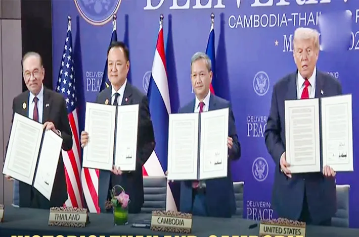 కంబోడియా, థాయిలాండ్ మధ్య సైనిక సంఘర్షణను ముగించడానికి తాము ఒక చారిత్రాత్మక ఒప్పందంపై సంతకం చేస్తున్నందుకు ఆగ్నేయాసియా ప్రజలందరికీ ఇది చిరస్మరణీయమైన రోజు అని ట్రంప్ అన్నారు. థాయ్, కంబోడియా నాయకుల మధ్య దృఢమైన కరచాలనంతో కుదిరిన ఈ ఒప్పందం, శాంతి, భద్రత పట్ల రెండు దేశాల అచంచల నిబద్ధతను ధృవీకరించే విస్తృత వాక్చాతుర్యాన్ని కలిగి ఉందని ఆయన పేర్కొన్నారు. వారు తమ సరిహద్దు వెంబడి మందుపాతర తొలగింపు ప్రయత్నాలను నిర్వహిస్తారని, భారీ ఆయుధాలను ఉపసంహరించుకుంటారని, ఆసియాన్ ప్రాంతీయ కూటమి నిర్వహించే కాల్పుల విరమణ పర్యవేక్షణ బృందాలకు ప్రవేశాన్ని అనుమతిస్తారని వెల్లడించారు.