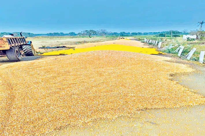 దారి పొడవునా మొక్కజొన్నలు ఆరబోయడంతో పసుపు వర్ణ శోభితంగా మారింది. మునుపెన్నడూ లేనివిధంగా ఈసారి యాసంగి సీజన్లో మొక్కజొన్న సాగు విస్తీర్ణం పెరగడం,దిగుబడి కూడా ఆశించిన మేర రావడంతో రైతులకు పంటనూర్పిడికి సరైన స్థలం లేక ఎక్కడ పడితే అక్కడే మొక్కజొన్నలను ఆరబోసుకుంటున్నారు.