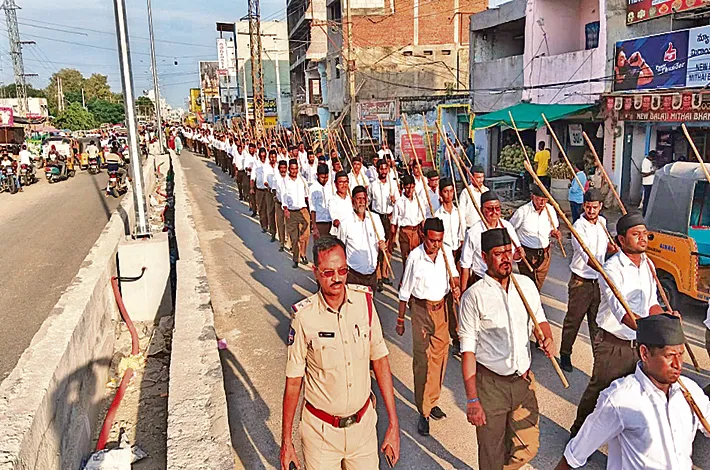 నల్గొండ రూరల్, అక్టోబర్ 5: హిందూ సంఘటన ద్వారానే దేశం రక్షించబడుతుందని హిందువుల ఐక్యతకు పంచ పరివర్తన్ ద్వారా ఆర్ఎస్ఎస్ కృషి చేస్తుందని ఆర్ఎస్ఎస్ నల్లగొండ విభాగ్ సంఘ చాలక్ గార్లపాటి వెంకటయ్య పేర్కొన్నారు. ఆర్ఎస్ఎస్ వందేళ్ల స్థాపన ఉత్సవాలలో భాగంగా నల్లగొండ నగర శాఖ ఆద్వర్యంలో స్థానిక మేకల అభినవ్ స్టేడియం నుండి నాగార్జున కళాశాల వరకు నల్లగొండ నగర పురవీధుల గుండా నగర స్వయంసేవకులు శనివారం పద సంచలన్ నిర్వహించారు.