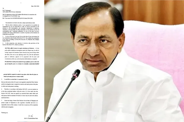 ఈ నేపథ్యంలో నిర్ణీత సమయానికి ఏసీపీ కార్యాలయానికి రావడం సాధ్యం కాదని స్పష్టం చేశారు. జూబ్లీహిల్స్ డివిజన్ ఏసీపీ పి.వెంకటగిరి జారీ చేసిన విచారణ నోటీసుపై కేసీఆర్ గురువారం లిఖితపూర్వకంగా స్పందించారు. క్రైం నంబర్ 243/2024 కేసు విచా రణలో భాగంగా శుక్రవారం విచారణకు హాజరు కావాలని ఇచ్చిన నోటీసుకు ప్రత్యుత్తరంగా, సీఆర్పీసీ సెక్షన్ 160 ప్రకారం తన నివాసంలోనే విచారణ జరపాలని ఆయన స్పష్టం చేశారు.