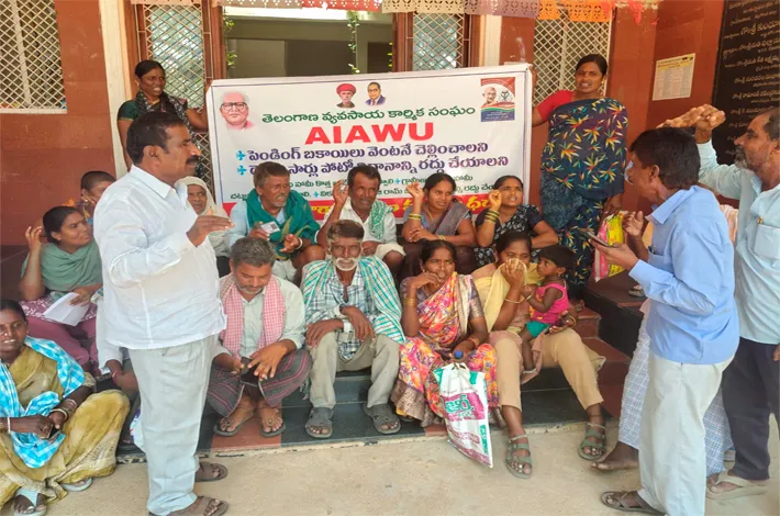 దేవరకొండ, ఏప్రిల్ 15 : విబి జి రామ్ జి చట్టాన్ని రద్దుచేసి ఉపాధి హామీ పథకాన్ని యధావిధిగా కొనసాగించాలి పని ప్రదేశాల్లో కనీస సౌకర్యాలు కల్పించాలి అని వ్యకాస రాష్ట్ర కమిటీ సభ్యులు కంబాలపల్లి ఆనంద్ డిమాండ్ చేశారు .బుధవారం దేవరకొండ ఎంపీడీవో కార్యాలయంలో ఉపాధి కూలీలతో వ్యవసాయ కార్మిక సంఘం ఆధ్వర్యంలో ధర్నా నిర్వహించి అనంతరం ఎంపిడిఓకి వినతి పత్రం అందజేశారు.