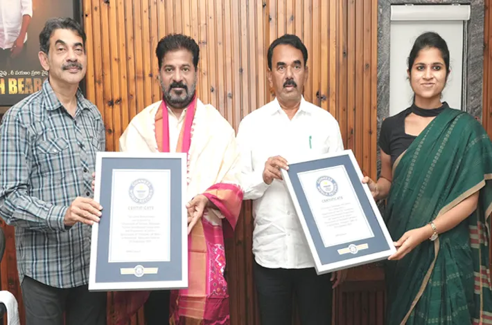 హైదరాబాద్: రాష్ట్ర ప్రభుత్వ ఆధ్వర్యంలో నిర్వహించిన అతి పెద్ద బతుకమ్మ గిన్నిస్ వరల్డ్ రికార్డు సాధించడంపై ముఖ్యమంత్రి రేవంత్ రెడ్డి హర్షం వ్యక్తం చేశారు. ఇందులో భాగంగానే ముఖ్యమంత్రి పర్యాటక శాఖ మంత్రి జూపల్లి కృష్ణారావుని, అధికారులను అభినందించారు. హైదరాబాద్ సరూర్నగర్ స్టేడియంలో రాష్ర్ట పర్యాటక శాఖ ప్రతిష్ఠించిన నిర్వహించిన బతుకమ్మ వేడుక అతిపెద్ద బతుకమ్మగా, అతిపెద్ద జానపద సంప్రదాయ నృత్యంగా గిన్నిస్ వరల్డ్ రికార్డు నమోదు చేసుకుంది.