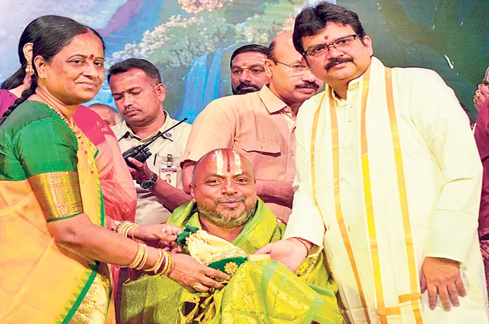 భద్రాచలం, మార్చి 19, (విజయక్రాంతి): భద్రాచలం శ్రీ సీతారామచంద్ర స్వామి వారి దేవస్థానం చెందిన ఉప ప్రధాన అర్చకులు శ్రీమాన్ అమరవాది మురళీకృష్ణమాచార్యులు అలాగే ఋగ్వేద పండితులు కే కామేశ్వరరావు పండితులకు ఉగాదిని పురస్కరించుకొని రాష్ట్ర ప్రభుత్వం ఘన సన్మానం నిర్వహించి అవార్డులు అందజేశారు. హైదరాబాద్ రవీంద్ర భారతి లో జరిగిన ఈ కార్యక్రమంలో దేవదాయ శాఖ మంత్రి కొండా సురేఖ,