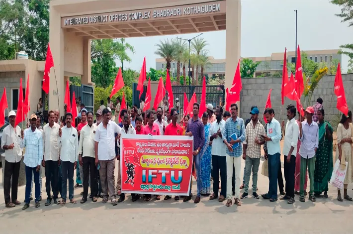 ఐఎఫ్టియు జాతీయ కమిటీ పిలుపు మేరకు సోమవారం భద్రాద్రి కొత్తగూడెం జిల్లా కలెక్టరేట్ కార్యాలయం ఎదుట ధర్నా నిర్వహించారు. యావత్తు కార్మిక వర్గం లేబర్ కోడ్లను వ్యతిరేకి స్తూ సార్వత్రిక సమ్మెలను నిర్వహించి తమ వ్యతిరేకతను తెలియజేసినప్పటికీ మోడీ ప్రభుత్వం కార్మిక ప్రయోజనాల కన్నా అంబానీ, అదాని లాంటి పిడికెడు మంది కార్పొరేట్లకు సంపదలను కట్టబెట్టటమే లక్ష్యంగా చేసుకొని నాలుగు లేబర్ కోడ్లను అమలు చేయటానికి పూనుకోవడం సిగ్గుచేటన్నారు.