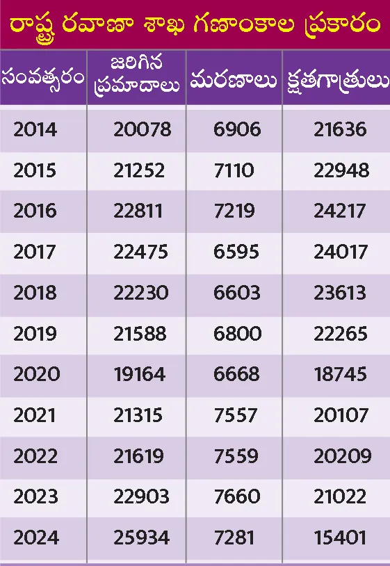 2016, 2017లో క్షతగాత్రుల సంఖ్య సుమా రు 24 వేల వరకు ఉండగా.. 2024 నాటికి ఈ సంఖ్య 15 వేలకు తగ్గిపోయింది. అయితే మరణాల విషయంలో.. 2020లో 6,668 మంది రోడ్డు ప్రమాదాల్లో మరణించగా.. 2024లో ఇదికాస్తా 7,281కి పెరగడం గమనార్హం. ప్రమాదాల సంఖ్యలోనూ భారీ తేడా కనపడుతోంది. 2014లో 20 వేలు గా ఉన్న ప్రమాదాల సంఖ్య 2024 నాటికి 25 వేలకుపైగా ప్రమాదాలు జరగడం గమనార్హం. అంటే రోడ్ల నిర్వహణ సరిగా లేకపోవడం, వాహనాల సంఖ్య ఇబ్బడి ముబ్బడిగా పెరగడం, గుంతల రోడ్లపై వే గంగా ప్రయాణించడం వల్ల దుర్ఘటనలు జరుగుతున్నాయని స్ప ష్టంగా చెప్పవచ్చు.