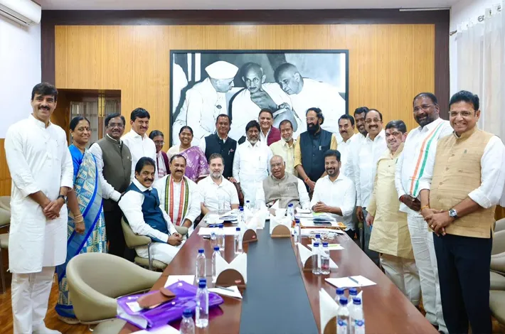 న్యూఢిల్లీ: తెలంగాణ కాంగ్రెస్ ముఖ్య నేతలతో ఏఐసీసీ అగ్రనేతల సమావేశం ముగిసింది. ఏఐసీసీ అధ్యక్షుడు మల్లికార్జున ఖర్గే(Mallikarjun Kharge) నివాసంలో 2 గంటల పాటు భేటీ కొనసాగింది. సమావేశంలో ఏఐసీసీ అగ్రనేతలు ఖర్గే, రాహుల్ గాంధీ, కేసీ వేణుగోపాల్, సీఎం రేవంత్ రెడ్డి(CM Revanth Reddy), డిప్యూటీ సీఎం భట్టి విక్రమార్క, మంత్రులు, పీసీసీ అధ్యక్షుడు మహేష్ కుమార్ గౌడ్, ఏఐసీసీ ఇన్ ఛార్జ్ మీనాక్షి నటరాజన్ పాల్గొన్నారు. రెండేళ్ల కాంగ్రెస్ పాలన, సంక్షేమ పథకాలపై సీఎం రేవంత్ రెడ్డి ప్రెజెంటేషన్ ఇచ్చారు.