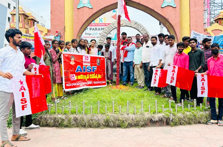 కరీంనగర్: అఖిల భారత విద్యార్థి సమాఖ్య (ఏఐఎస్ఎఫ్) 89వ ఆవిర్భావ దినోత్సవం సందర్భంగా కరీంనగర్ లోని కమాన్ చౌరస్తాలో ఏర్పాటు చేసిన ఏఐఎస్ఎఫ్ జెండాను ఏఐఎస్ఎఫ్ జాతీయ మాజీ అధ్యక్షులు వల్లి ఉల్లా ఖాద్రి సోమవారం ఆవిష్కరించారు. ఈ సందర్భంగా వలి ఉల్లా ఖాద్రి మాట్లాడుతూ... స్వాతంత్ర్యం రాక పూర్వమే దేశంలోనే మొట్టమొదటి విద్యార్థి సంఘంగా ఉత్తరప్రదేశ్ రాజధాని లక్నో మహానగరంలో భగత్ సింగ్, రాజ్ గుర్, సుఖ్ దేవ్, ఆజాద్ లు ఇంకా ఎందరో వీరుల ఆశయ సాధన కోసం బాబుద్దీన్ బాస్, ప్రేమ్ నారాయణ భార్గవ్ ల నాయకత్వాన ఆగస్టు 12, 1936 తేదీన ఏఐఎస్ఎఫ్ ఆవిర్భవించిందని ఆయన తెలిపారు.